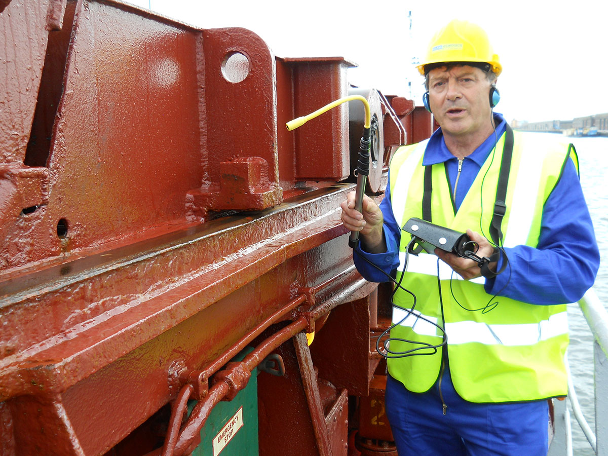 The surveyor begins to inspect the hatch, holding the microphone against the hatch seals. Any gaps through which air or water can pass will allow the ultrasonic signal to pass and can be detected.